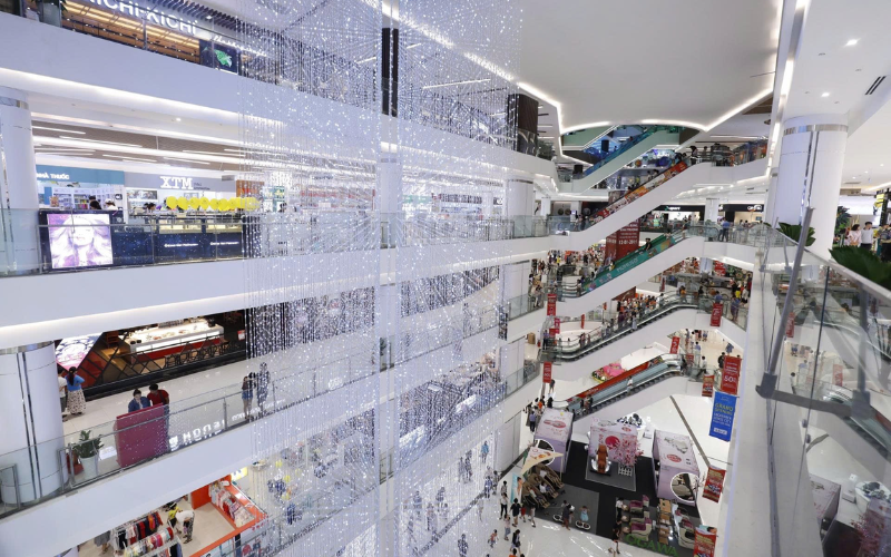 Toàn cảnh sảnh chính nhiều tầng hiện đại của Gigamall nhìn từ trên cao, với thang cuốn, ánh sáng trang trí và khách hàng mua sắm.