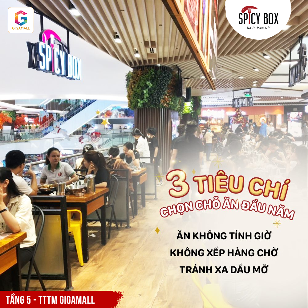 Đặc biệt, Buffet tại Spicy Box không giới hạn thời gian ăn và giá vé bao gồm nước ngọt uống thoải mái. Không gian mở tại Spicy Box - Gigamall, không chỉ phù hợp cho cả gia đình khi muốn có một buổi ăn tối thoải mái mà còn là địa điểm ăn uống lý tưởng cho các nhóm bạn trẻ yêu thích ẩm thực từ xứ sở Hàn Quốc.