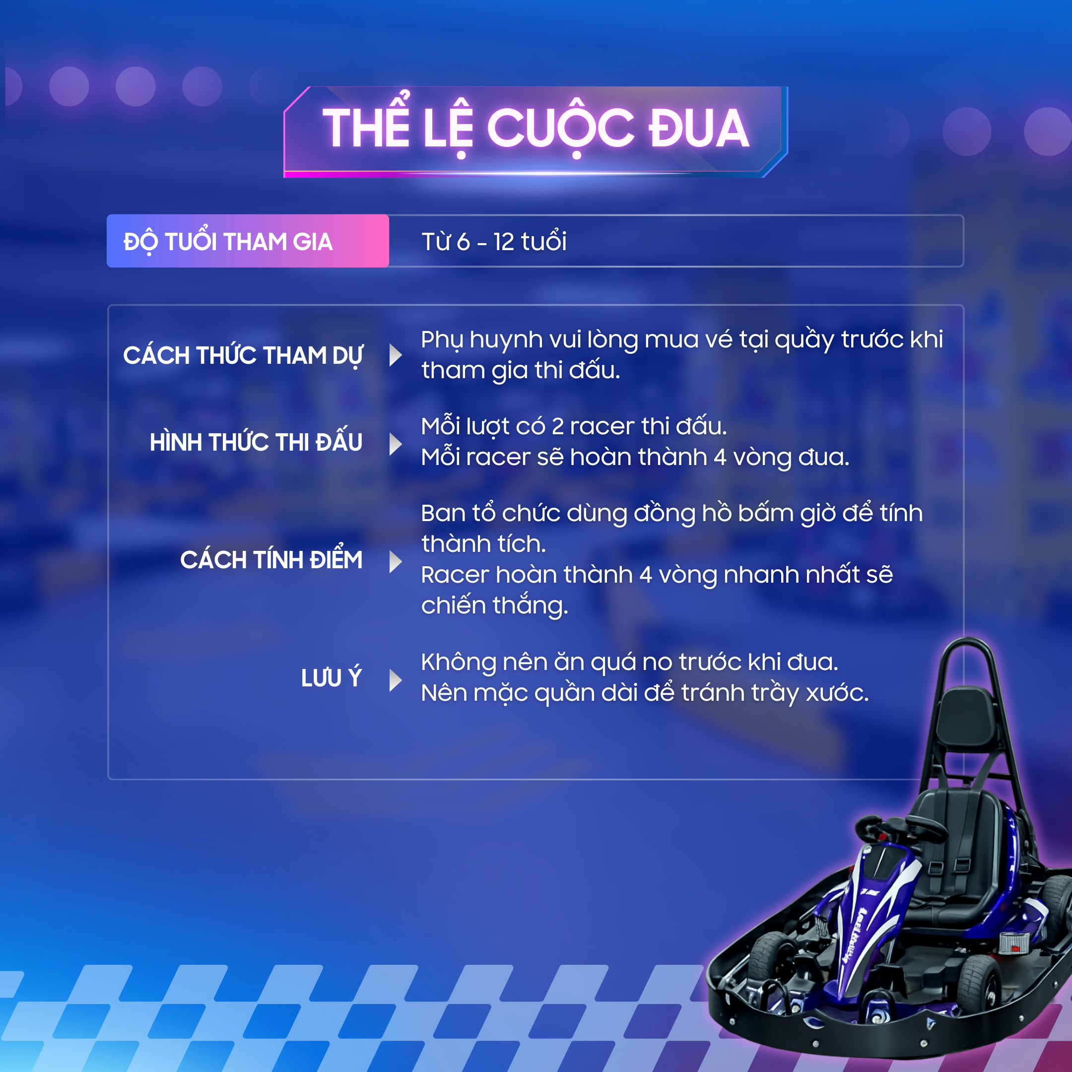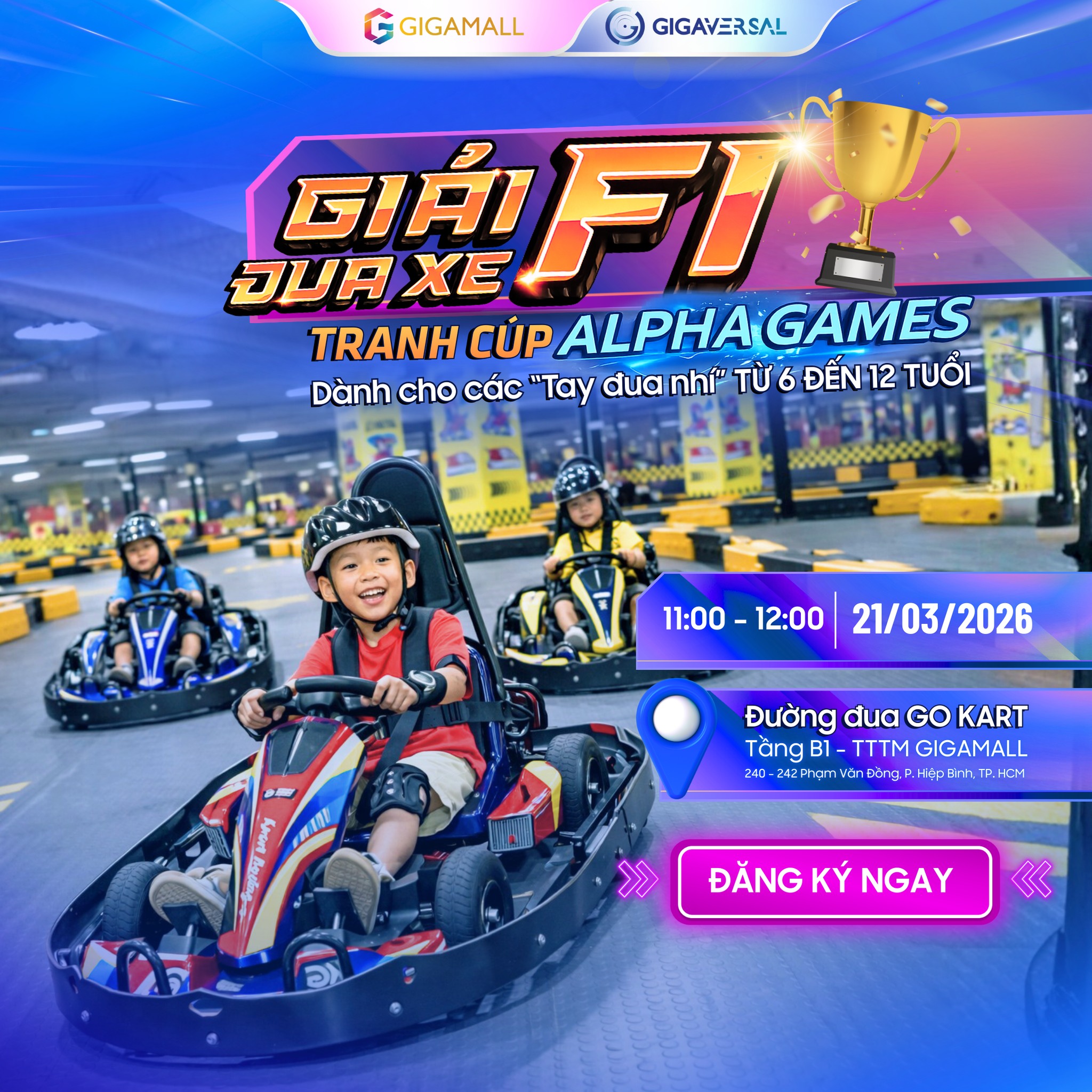 Ngày 21/03 này, ba mẹ hãy để các bé thử cảm giác làm tay đua nhí thật sự. Cầm chắc vô lăng, tăng tốc qua từng khúc cua và hào hứng cán đích trong tiếng cổ vũ của ba mẹ nhé!