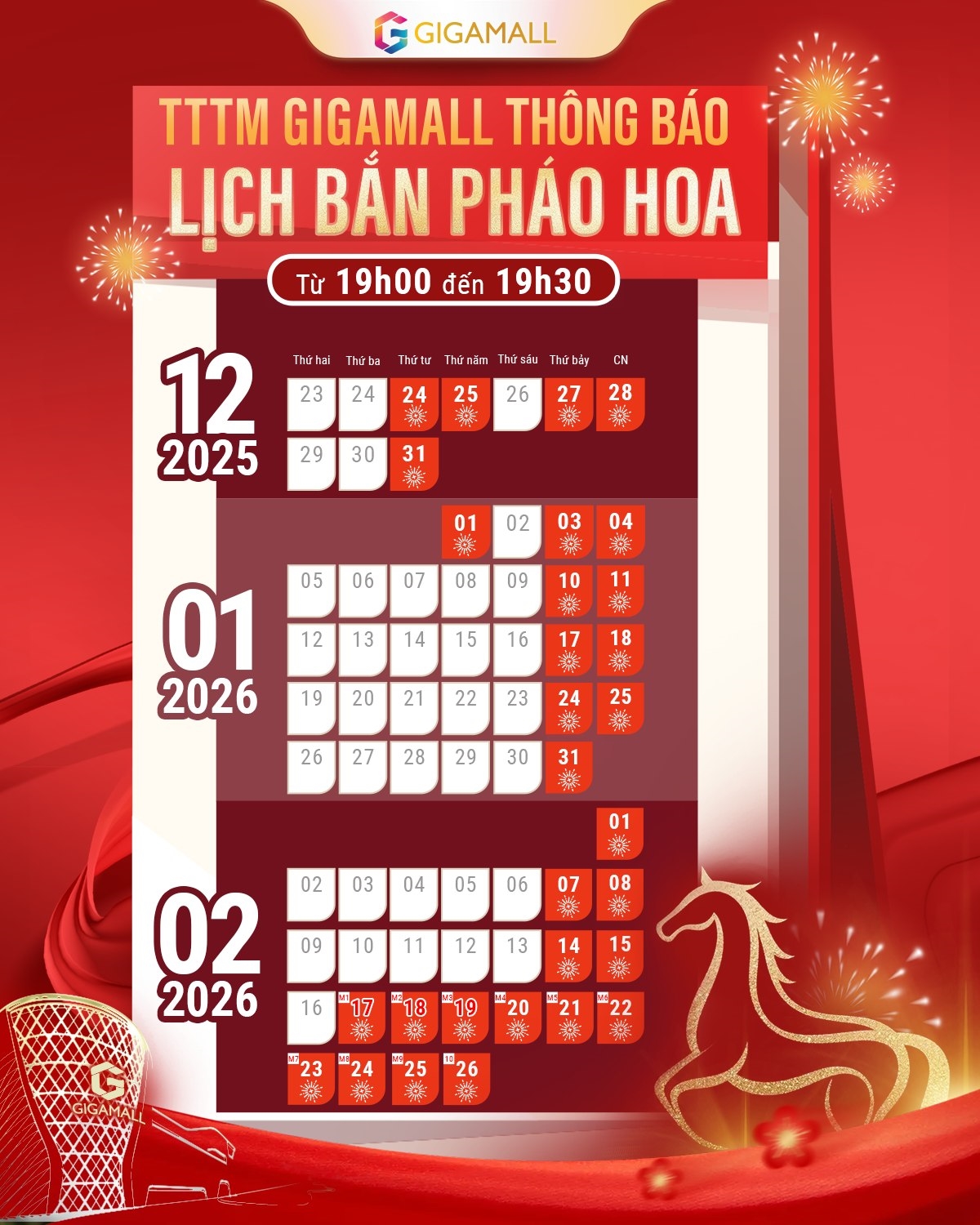Các bạn hãy lưu ngay lịch bắn pháo hoa và cùng gia đình, bạn bè đến Gigamall tận hưởng không khí lễ hội, năm mới thật rực rỡ và đáng nhớ nhé!