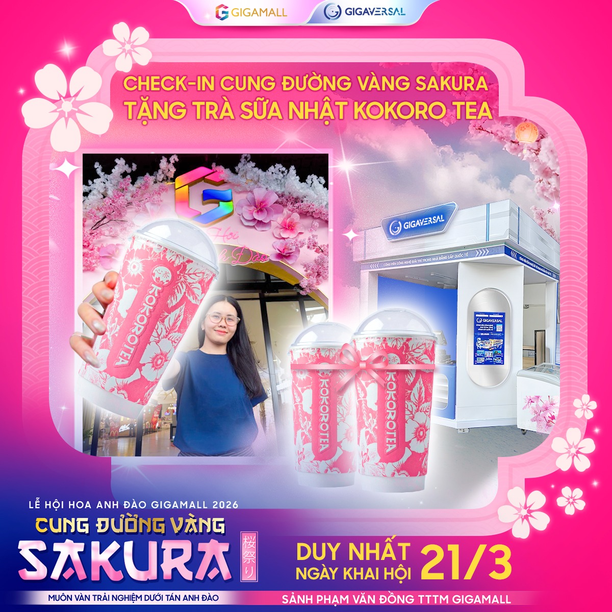 CHECK-IN SỚM – NHẬN QUÀ LIỀN TAY: Tặng Trà sữa Nhật Kokoro Tea & voucher game Gigaversal cho những khách check-in sớm nhất tại Cung đường vàng Sakura