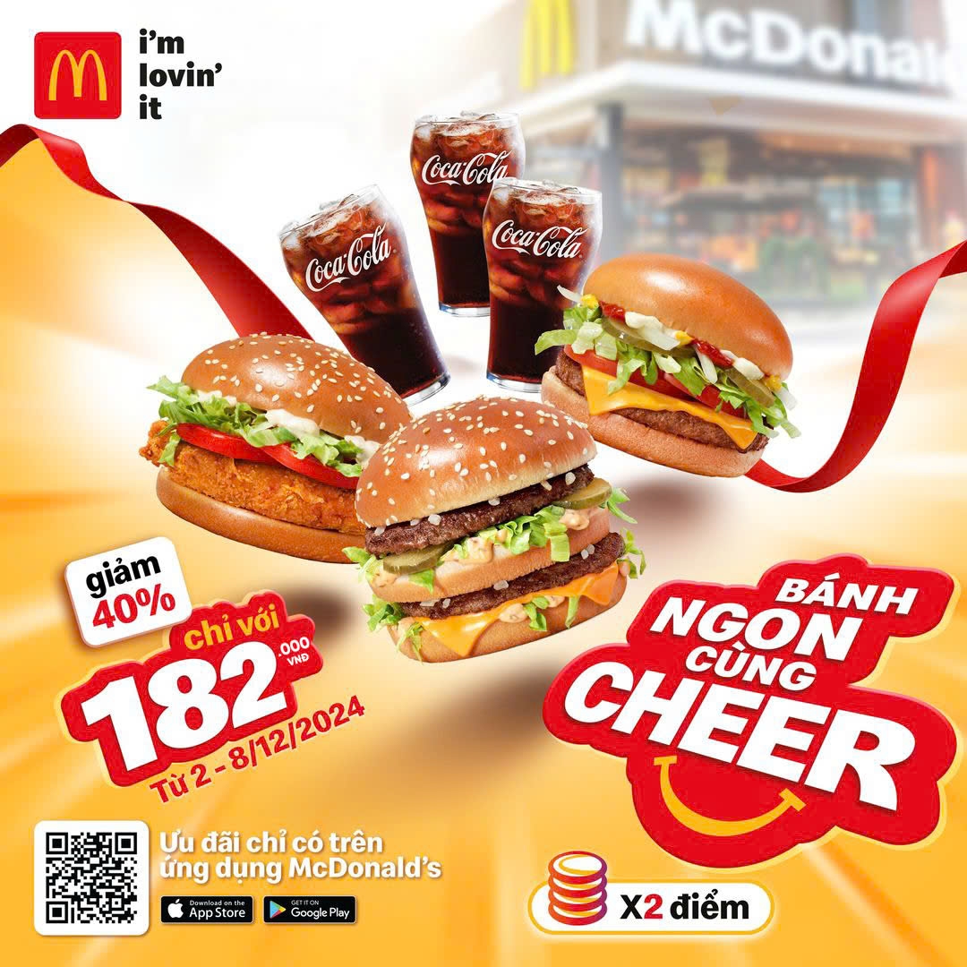 Tụi tui quyết tâm chinh phục mọi vị giác, mọi sở thích của các tín đồ mê măm măm. Lần này là combo mới toanh “BÁNH NGON CÙNG CHEER" dành riêng cho hội Burger Lover, duy nhất từ 02.12 - 08.12.2024 Chỉ trong 1 combo có sự xuất hiện 3 chiếc burger thơm ngon trứ danh gồm: BIG MAC, BURGER BÒ PHÔ MAI ĐẶC BIỆT, BURGER PHI LÊ GÀ GIÒN CAY kèm 3 LY NƯỚC SIZE L tha hồ vừa ăn uống phủ phê vừa tám 7749 chuyện cùng bạn bè hay gia đình. Đỉnh nhất chính là chiếc giá siêu yêuuuu của combo này CHỈ 182.000Đ. Đặc biệt, khi thanh toán bằng thẻ NAPAS hoặc Mastercard (*), mí bồ còn được giảm hẳn 20.000Đ, nghĩa là chỉ còn 162.000Đ cho sự ê hề này thôi đóooo. ️Chưa hết nà, mấy bồ còn được x2 điểm loyalty cho 02 lần mua đầu tiên trên app McDonald’s. Hướng dẫn sử dụng: Chọn ưu đãi trên ứng dụng McDonald’s https://bitly.cx/TaiAppMcDonalds và quét mã trên máy bán hàng tự động trước khi chọn món tại cửa hàng. (*) Ưu đãi thanh toán qua máy Payoo POS: giảm 20.000Đ cho hoá đơn trên 40K khi dùng thẻ Mastercard hoặc NAPAS thanh toán tại cửa hàng, từ giờ đến 31/12/2024 (hoặc đến khi hết số lượng ưu đãi). Mỗi khách hàng hưởng ưu đãi tối đa 10 lần/thẻ trong suốt thời gian diễn ra chương trình. Đối với ưu đãi thanh toán này có 2 lưu ý nhỏ dành cho mấy bồ: Chương trình chỉ áp dụng cho dòng thẻ contactless (Thẻ thanh toán không tiếp xúc). Khách iu cần đặt hàng tại quầy hoặc chọn "Thanh Toán Tại Quầy" khi sử dụng máy bán hàng tự động để nhân viên cửa hàng hỗ trợ áp dụng ưu đãi nghen.