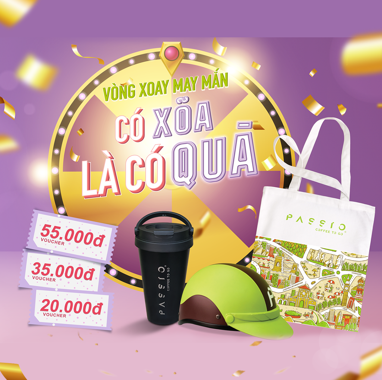 Passio Coffee tặng bạn chương trình VÒNG XOAY MAY MẮN với cơ hội 100% quay là trúng những phần quà hấp dẫn sau: